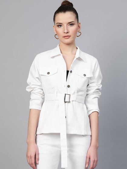SASSAFRAS Curve Plus Size White Self Design Mock Collar Bomber Jacket