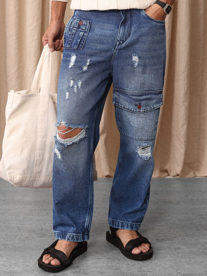Mr Bowerbird Men Pure Cotton Oversized Fit Mildly Distressed Heavy Fade Cargo Style Jeans