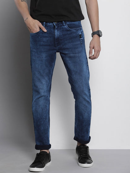 Bewakoof Men's Blue Straight Fit Distressed Mid-Rise Jeans