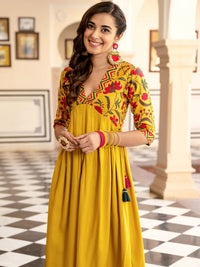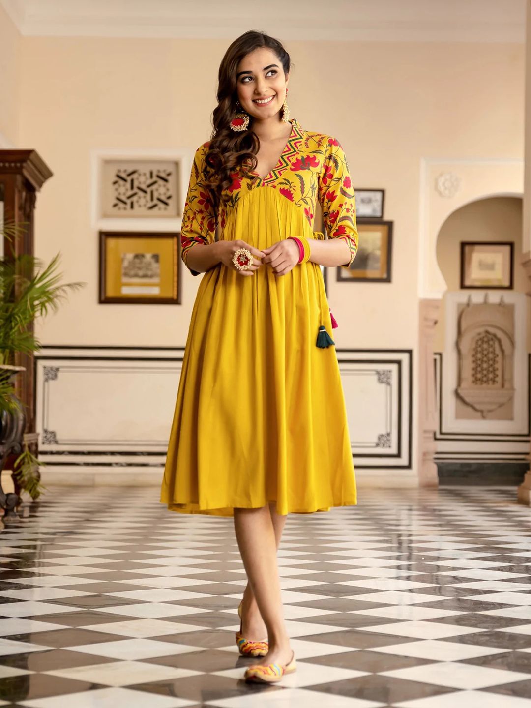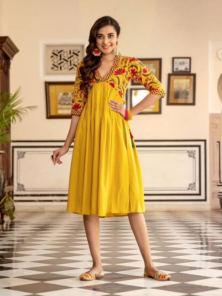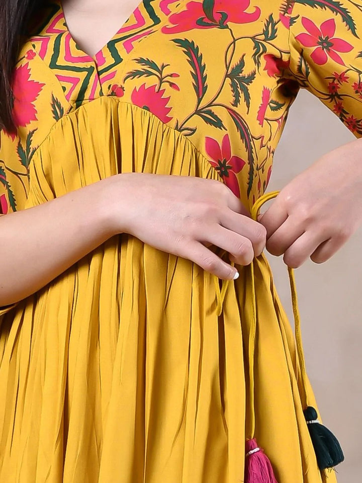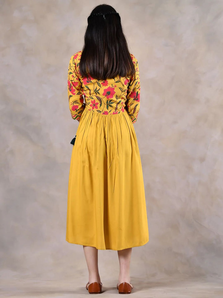 Rustorange Mustard Yellow & Pink Floral Liva A-Line Midi Dress