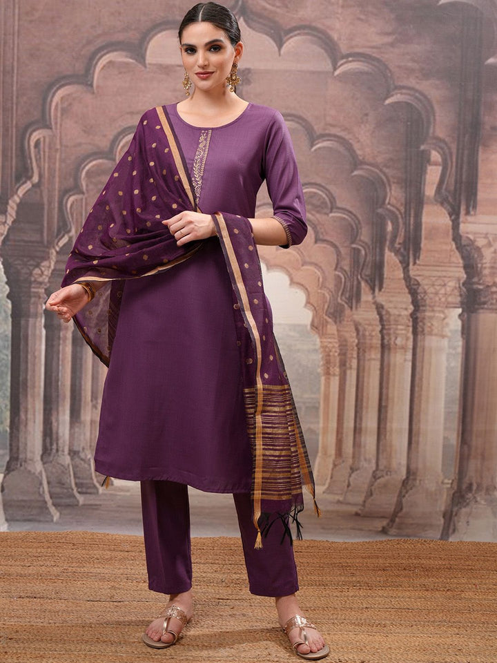 Vishudh Purple Embroidered Round Neck Straight Kurta with Trouser & Dupatta