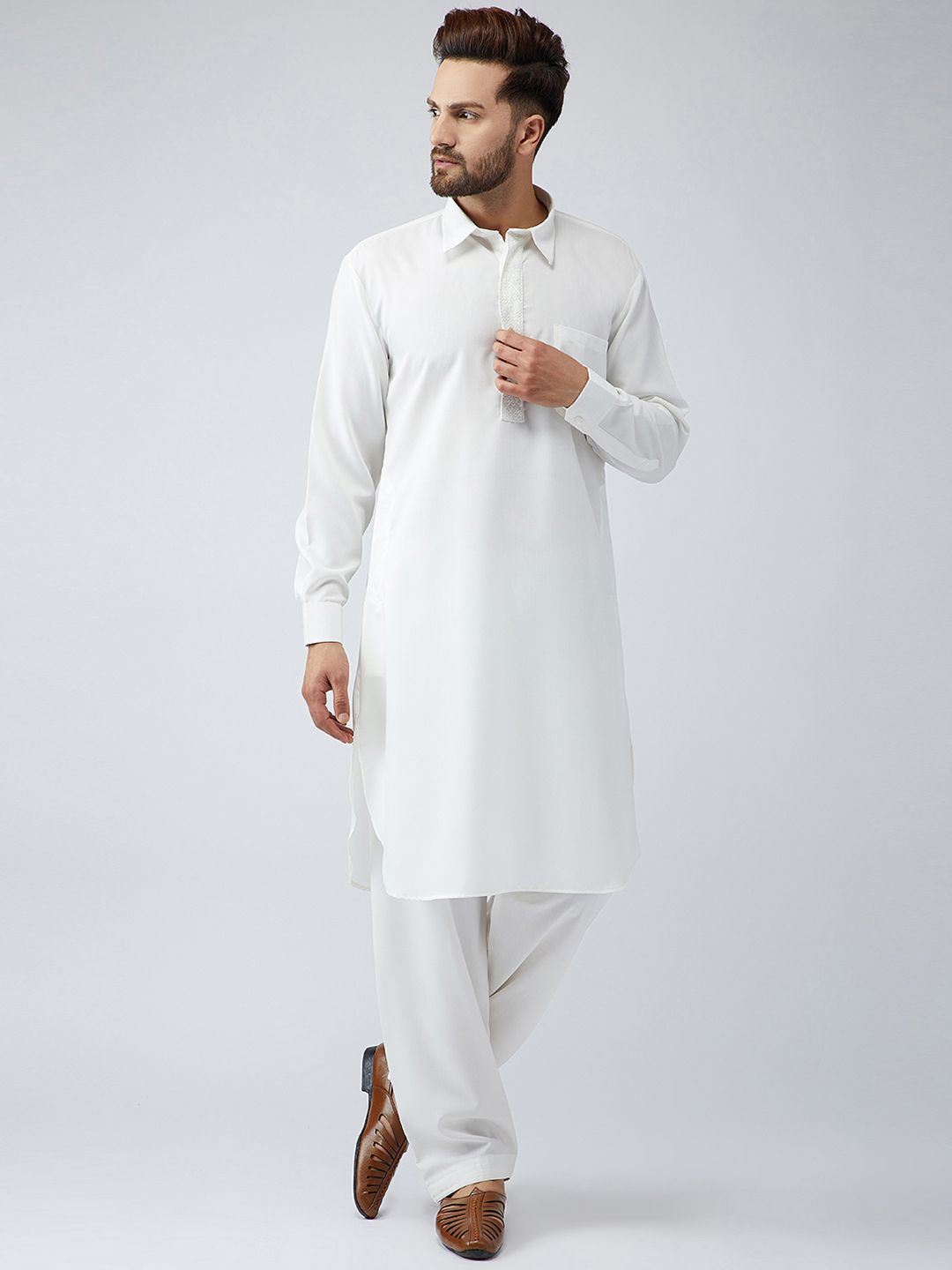 Off-White pathani knee length kurta, has a shirt collar, long sleeves, curved hem, side slits