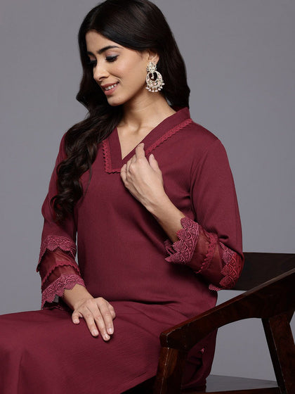 Varanga Rust Flared Sleeve Organza detailed V Neck Textured Kurta with Palazzo