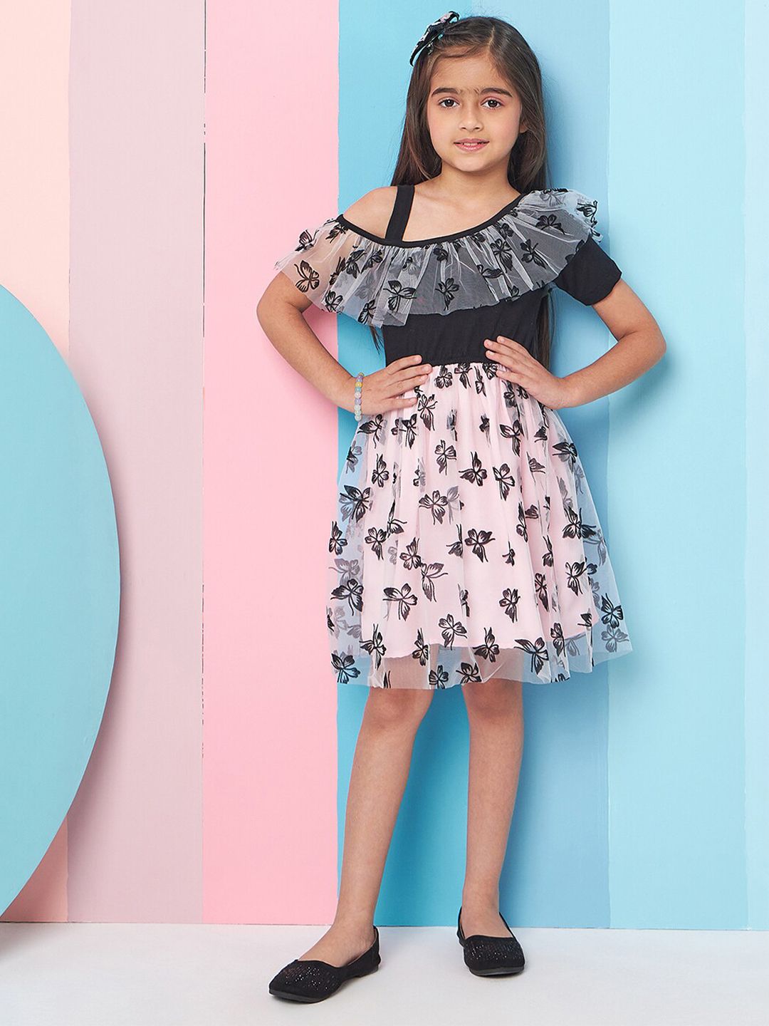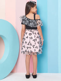pspeaches Girls Floral Print Cold-Shoulder Woollen Net Fit & Flare Dress