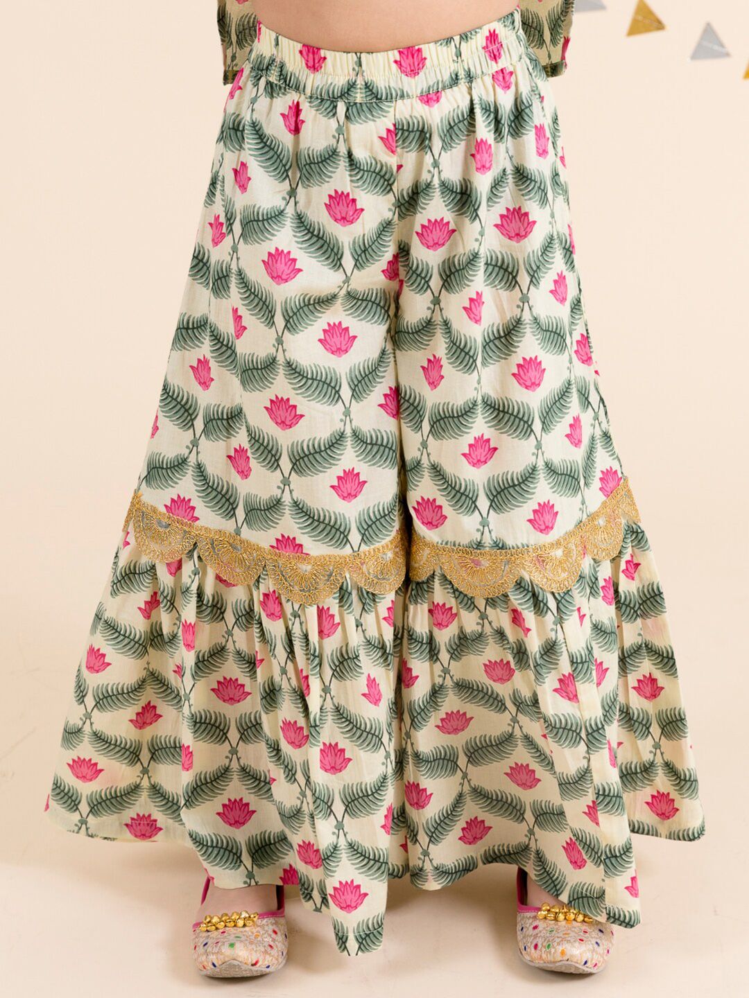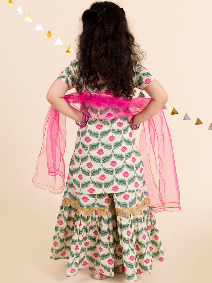 pspeaches Girls Off White Floral Yoke Design Empire Pure Cotton Kurti with Skirt & With Dupatta