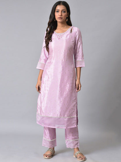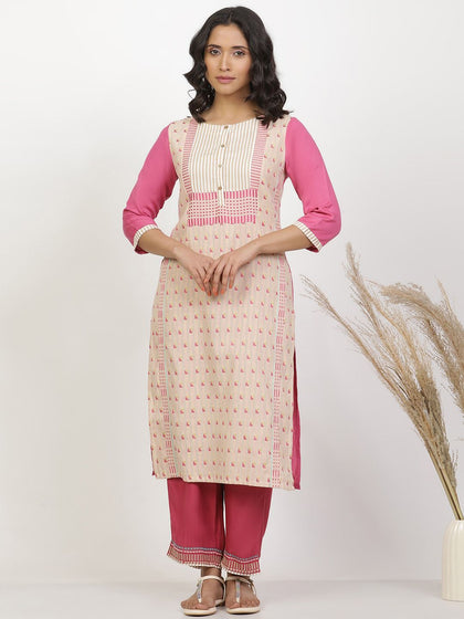 W Floral Printed Round Neck Pure Cotton Straight Kurta With Trouser