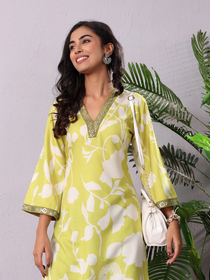 Varanga Floral Printed V-Neck Straight Cotton Kurta
