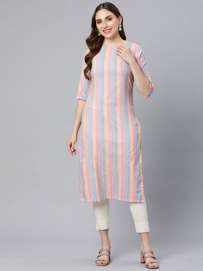 KALINI Striped Woven Design Mandarin Collar Three-Quarter Sleeves Straight Kurta