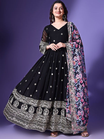 KALINI Floral Embroidered V Neck Gotta Patti Work Georgette Anarkali Kurta With Dupatta