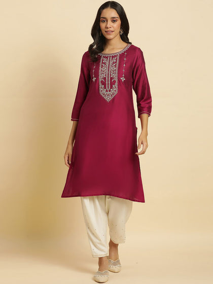 W Embroidered Beaded V-Neck Linen Straight Kurta
