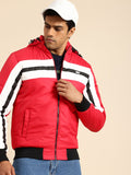 Red and white striped puffer jacket, has a hood, 2 pockets,has a zip closure, long sleeves, a straight hemline, and polyester lining
