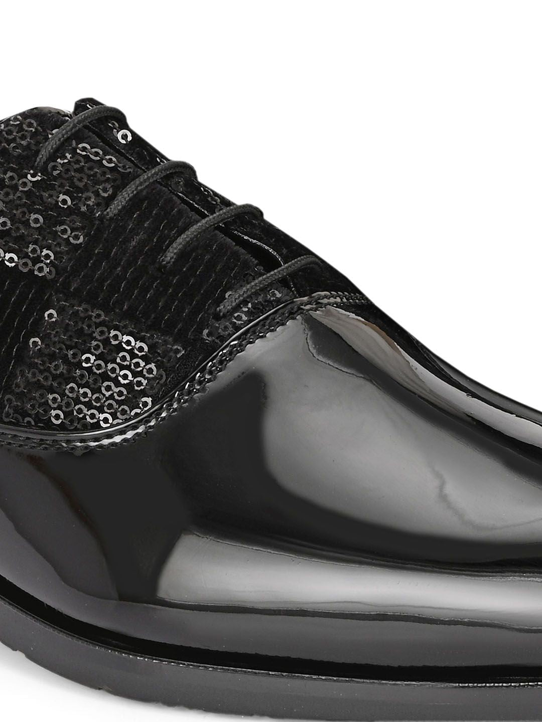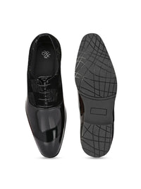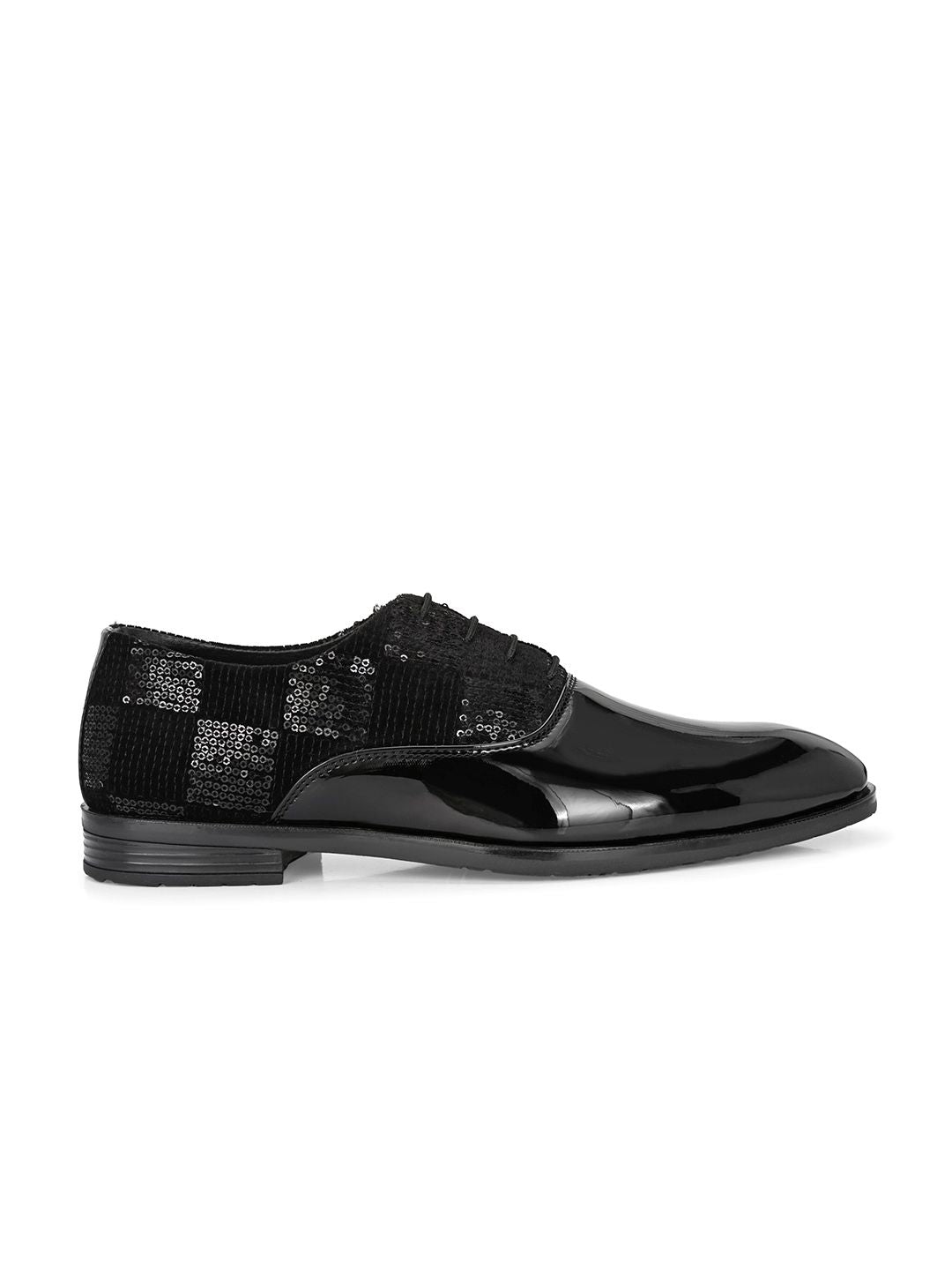 A pair of black solid round-toe formal derbeys with textured details and regular styling has a lace-up closure