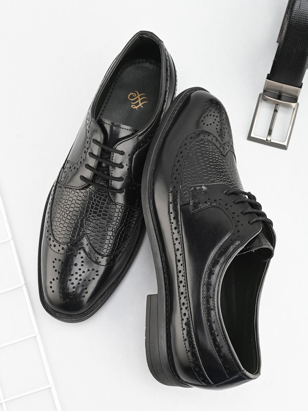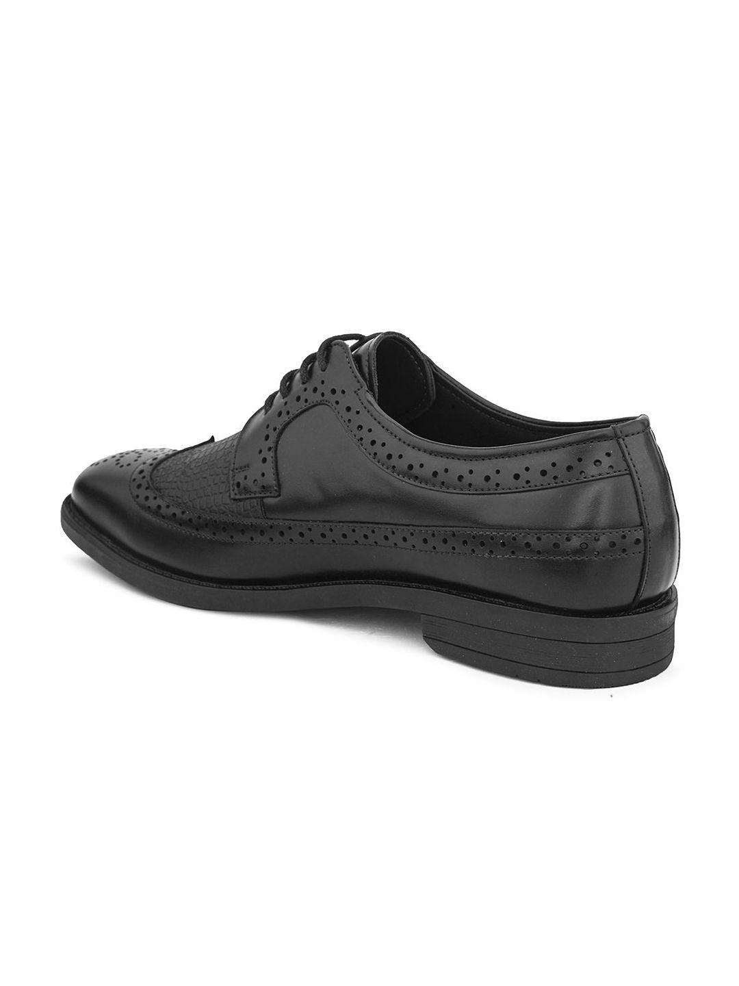 A pair of black textured brogue, has mid-top ankle and laced-up fastening and back detail