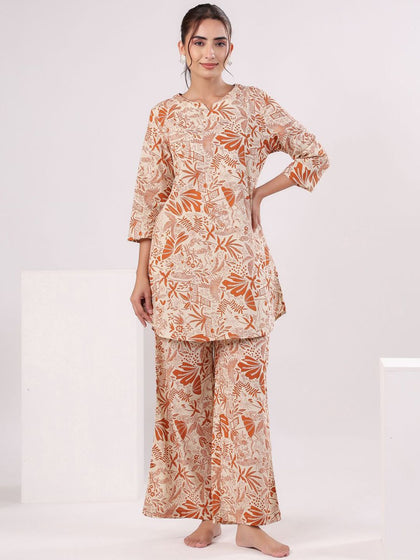 SANSKRUTIHOMES Women Beige Pure Cotton Floral Print Pyjama Set