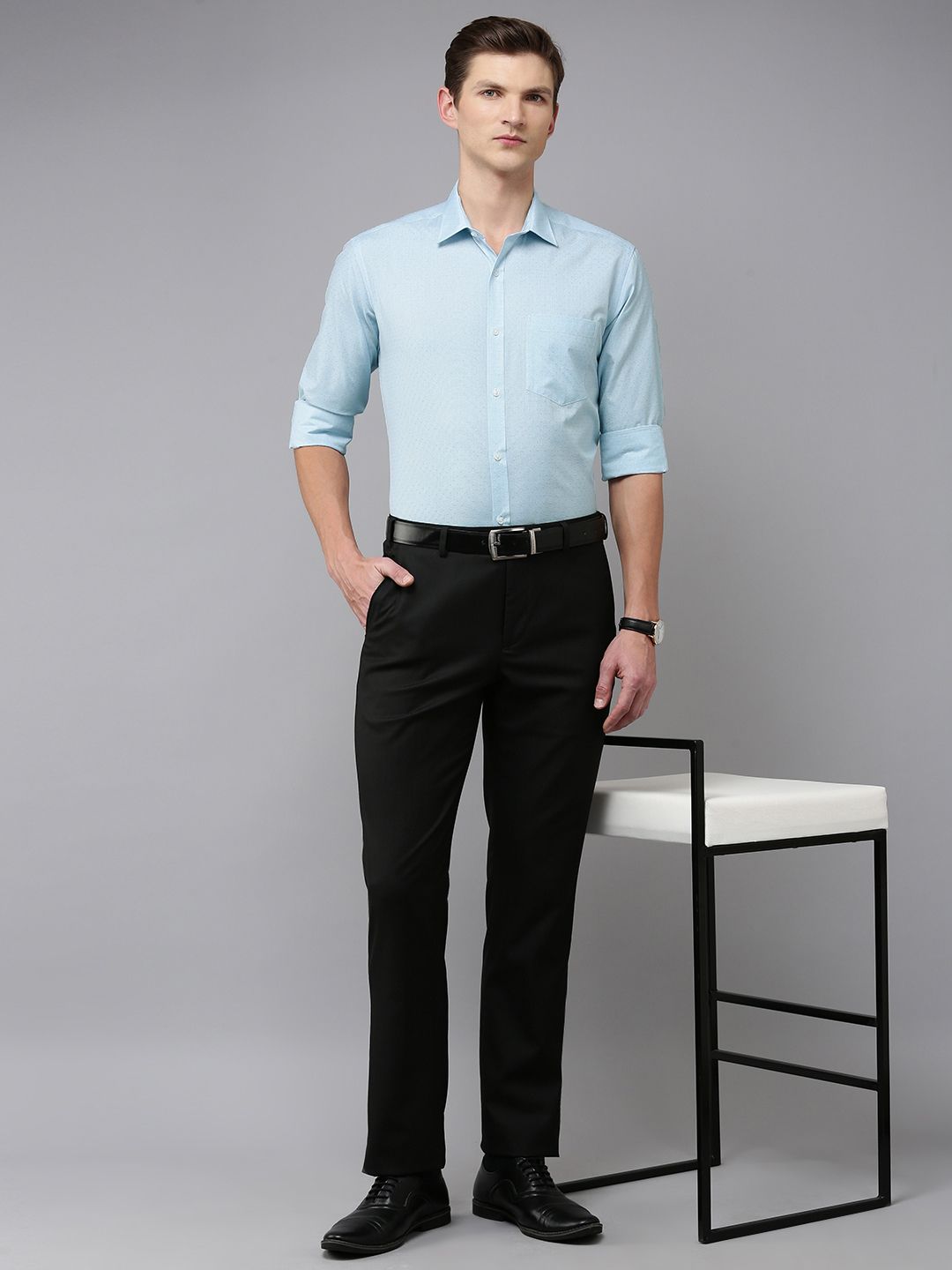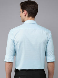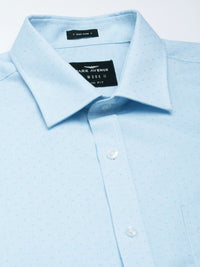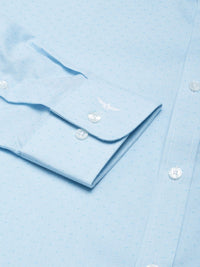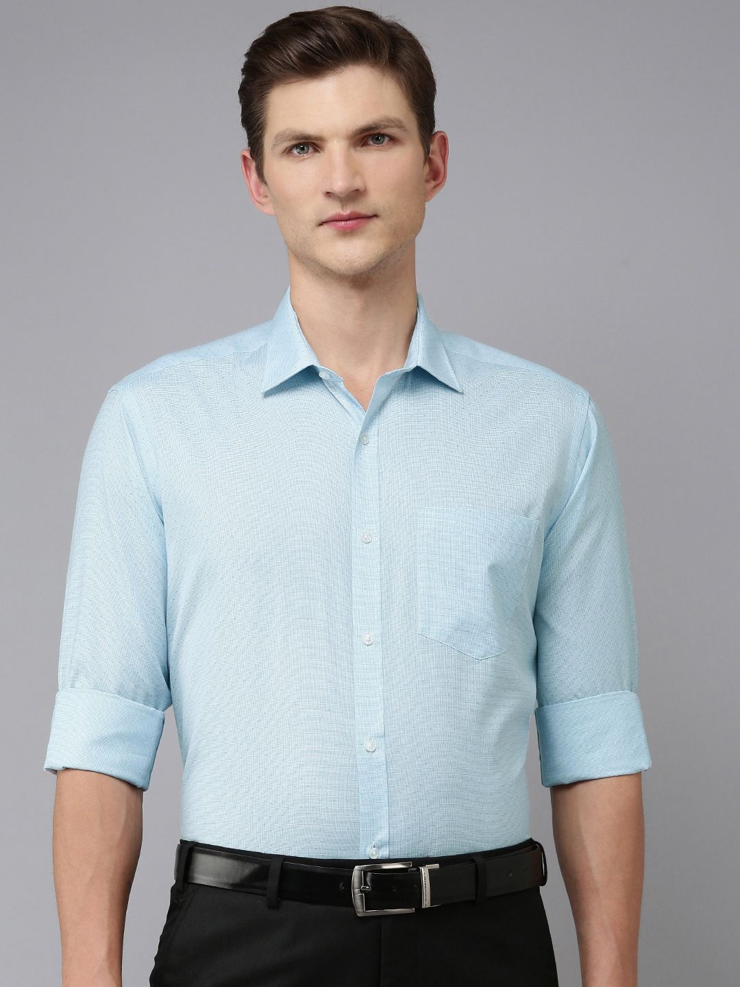 Blue textured self design opaque formal shirt, has a spread collar, button placket, 1 patch pocket, long regular sleeves, curved hem