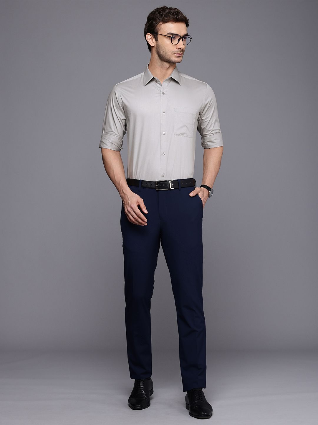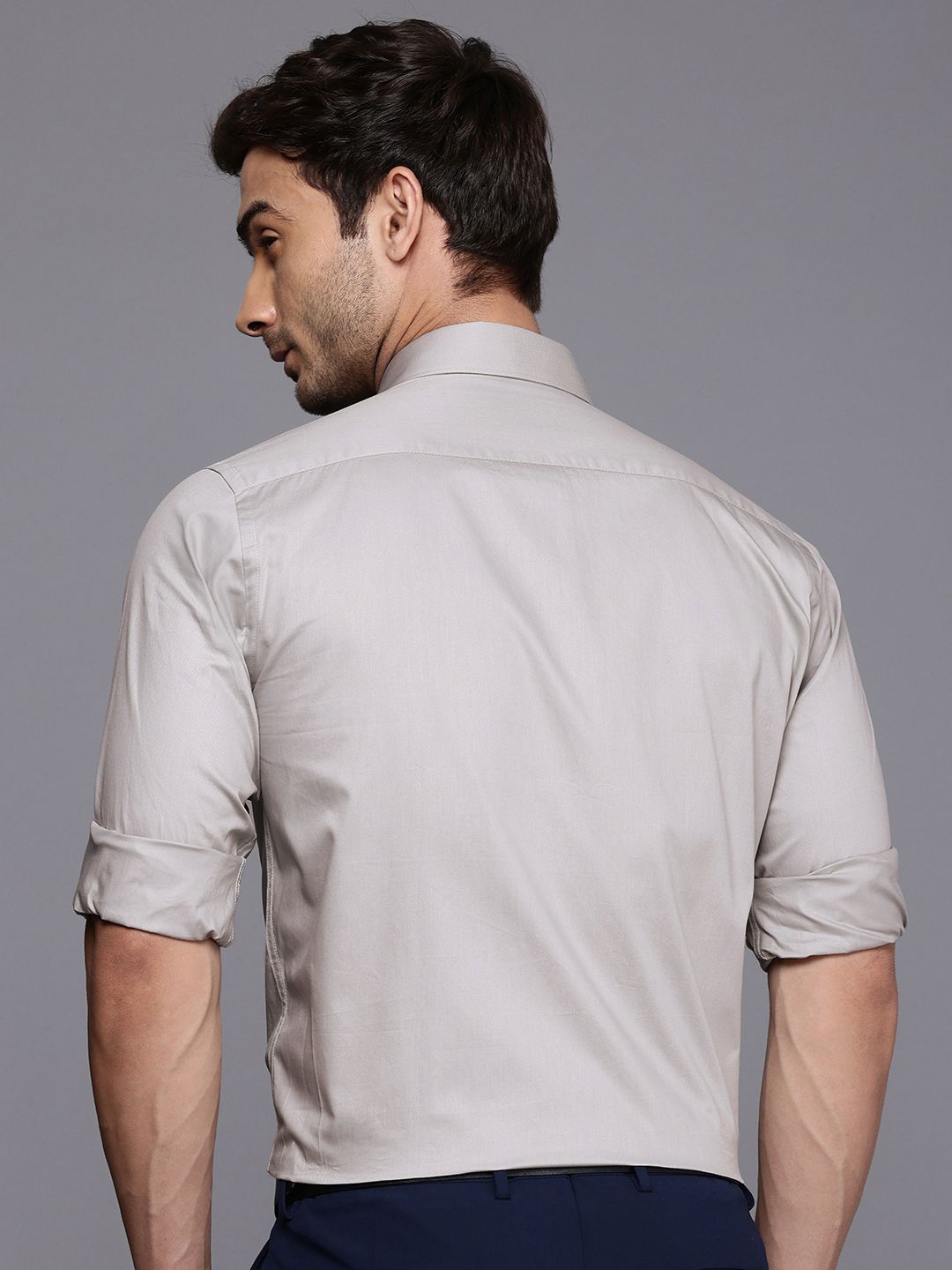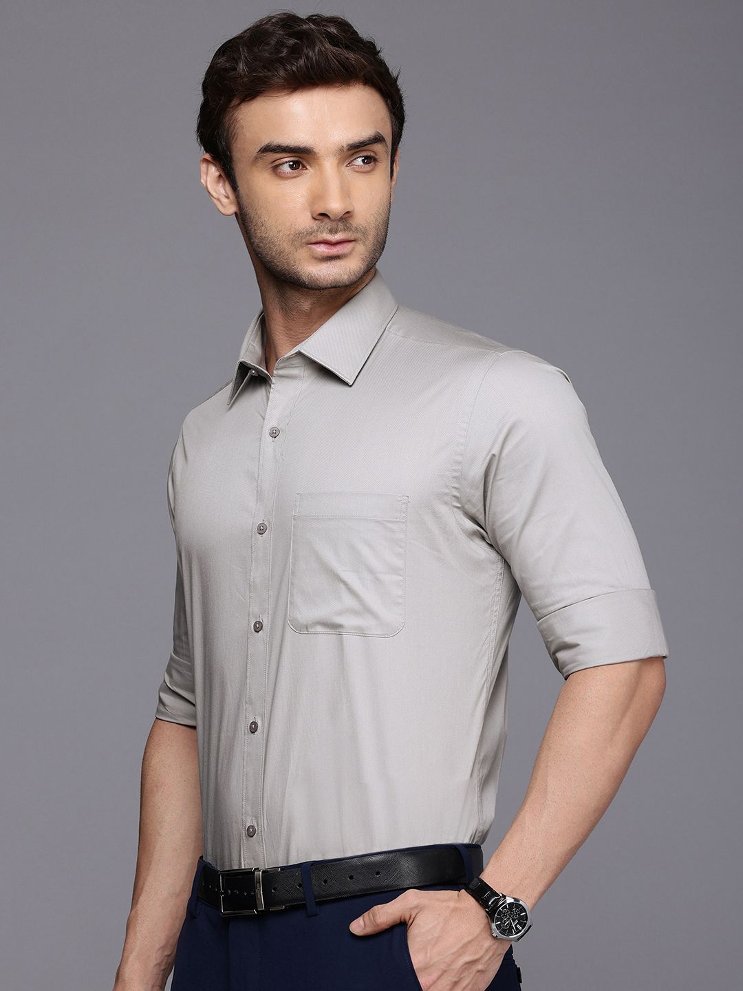 Grey solid opaque formal shirt, has a cutaway collar, button placket, 1 patch pocket, long regular sleeves, curved hem