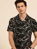 Black & white abstract printed opaque casual shirt, has a cuban collar, button placket, short regular sleeves, curved hem