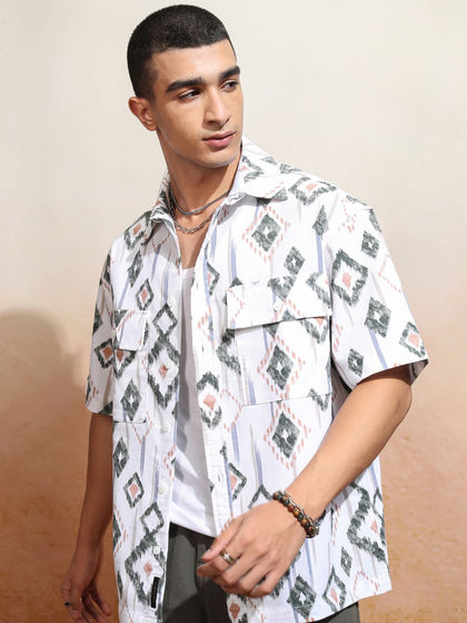 THE BEAR HOUSE Men White & Blue Slim Fit Printed Casual Shirt