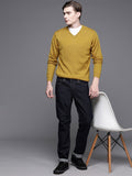 Mustard yellow solid pullover ,has a v-neck, long sleeves, ribbed hem