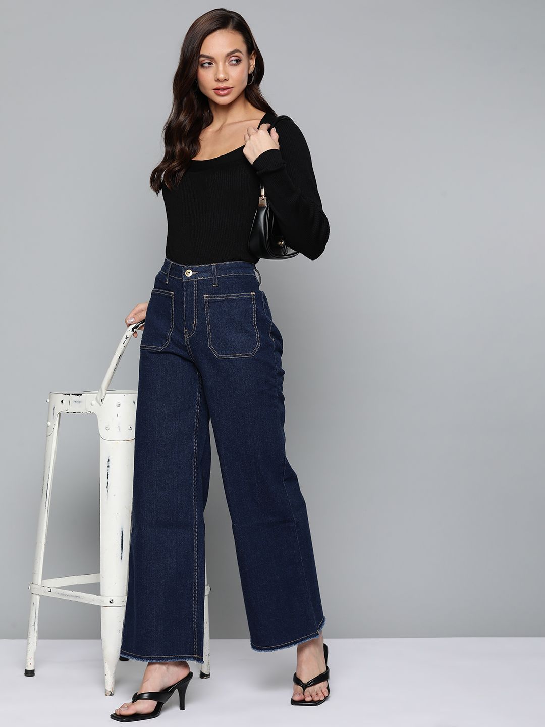Black solid pullover ,has a scoop neck, long sleeves, straight hem