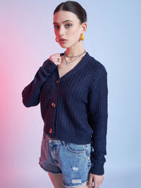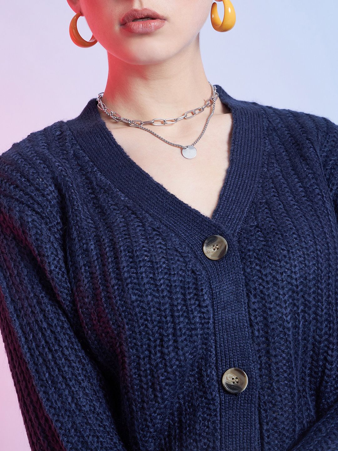 Blue self design cardigan ,has a v-neck, long sleeves, button closure, ribbed hem