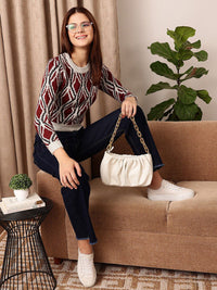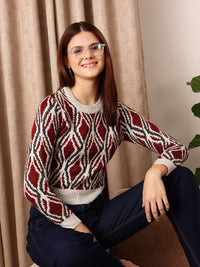 White self design pullover ,has a round neck, long sleeves, ribbed hem