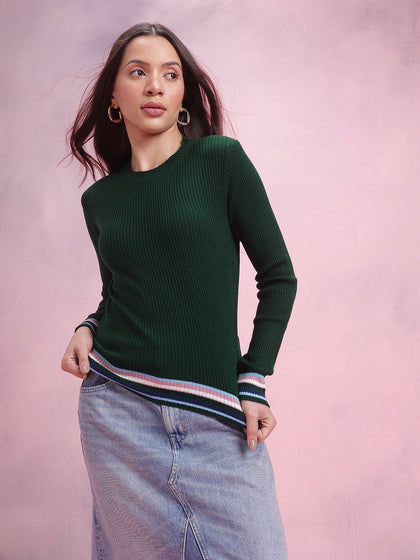 STREET 9 Green Cable Knit Self Design Turtle Neck Acrylic Crop Pullover Sweater