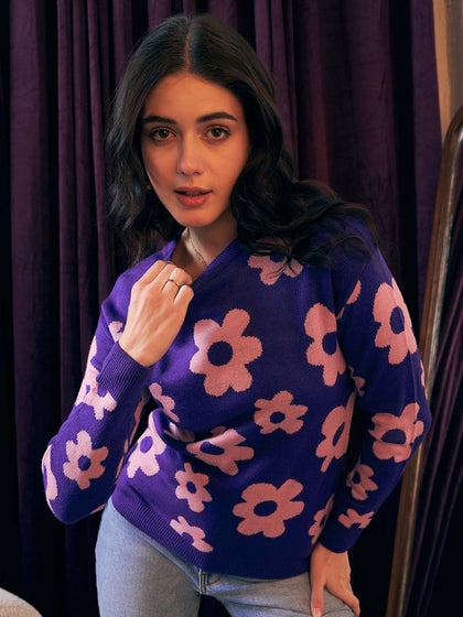 Berrylush Purple Floral Printed Pullover
