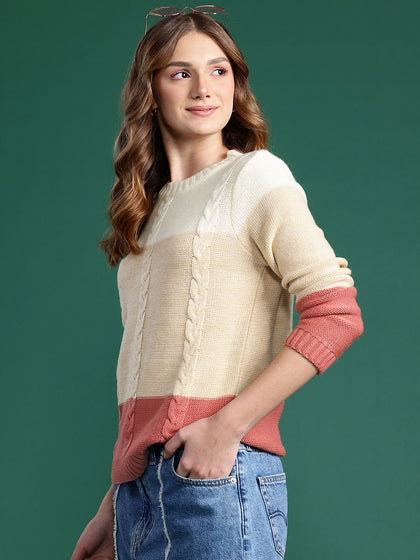 DressBerry Women Pink Self-Striped Pullover Sweater