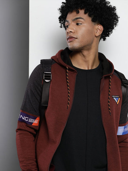 The Indian Garage Co Men Red & Grey Colourblocked Hooded Sweatshirt
