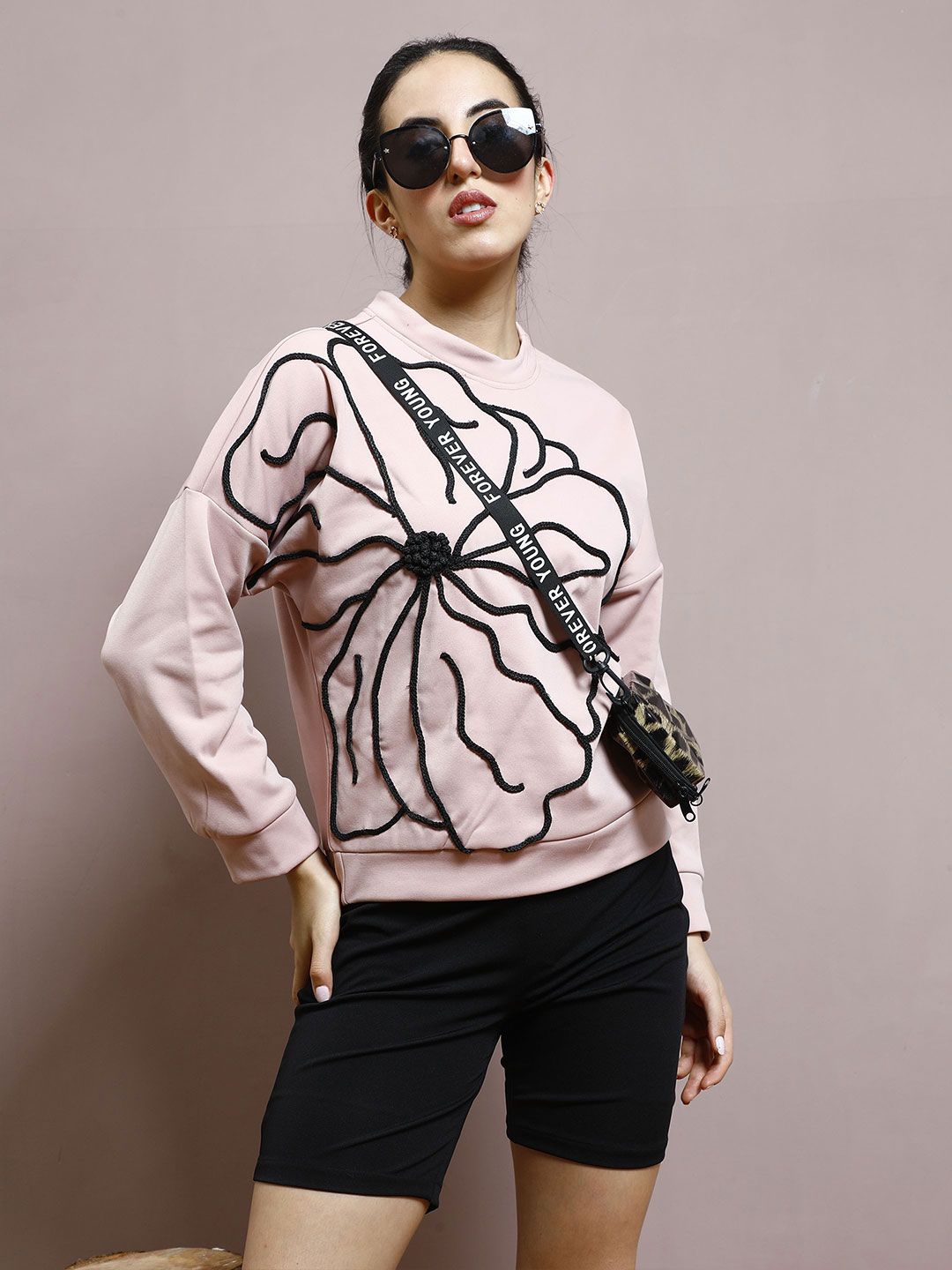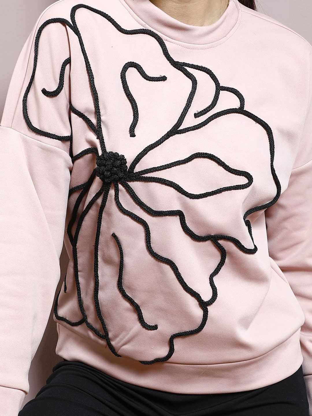 Pink and Black embroidered sweatshirt has a round neck,pockets, long sleeves, closure, Ribbed hem