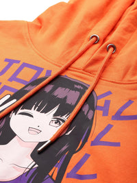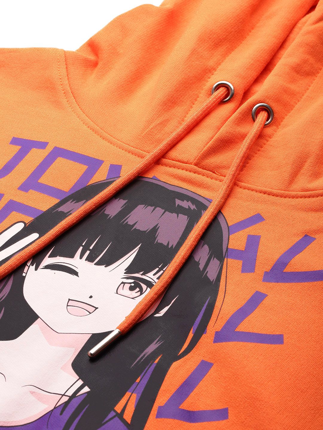 Orange printed sweatshirt has a hood, long drop-shoulder sleeves, and ribbed hem