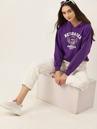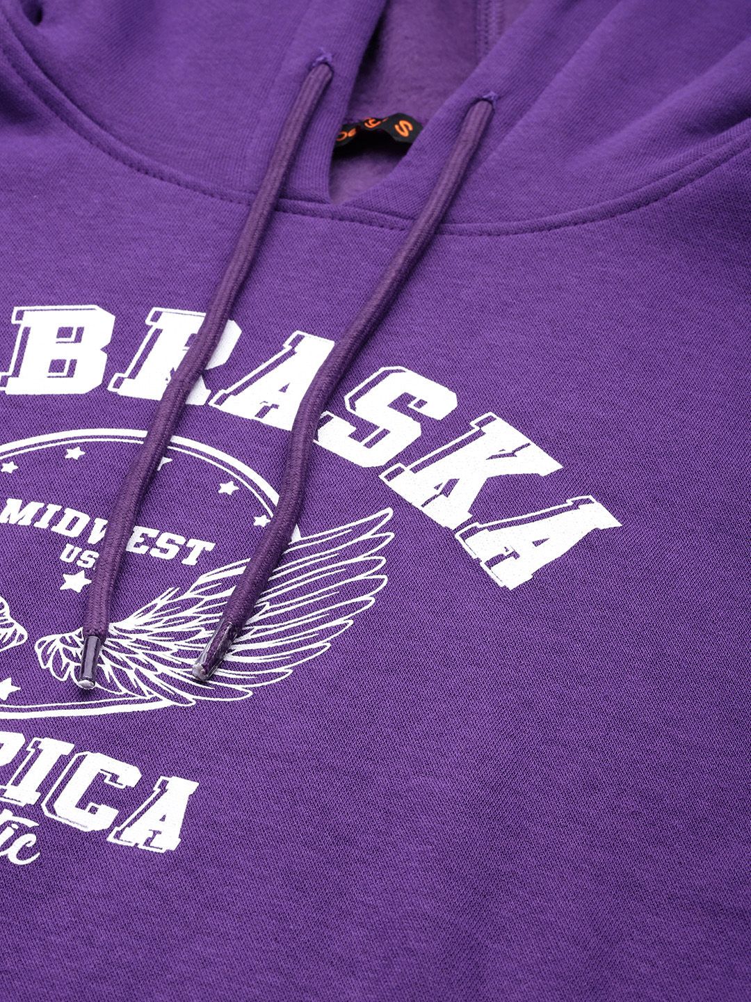 Purple printed sweatshirt has a hooded, long sleeves, closure, ribbed hem