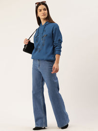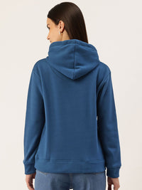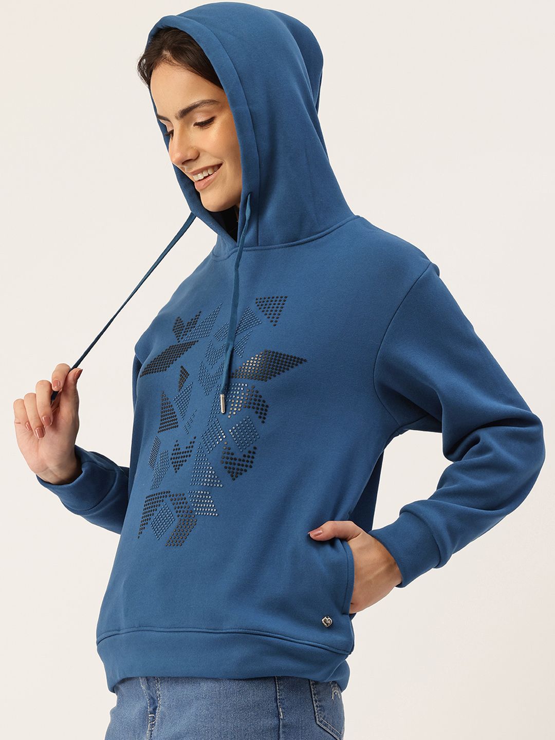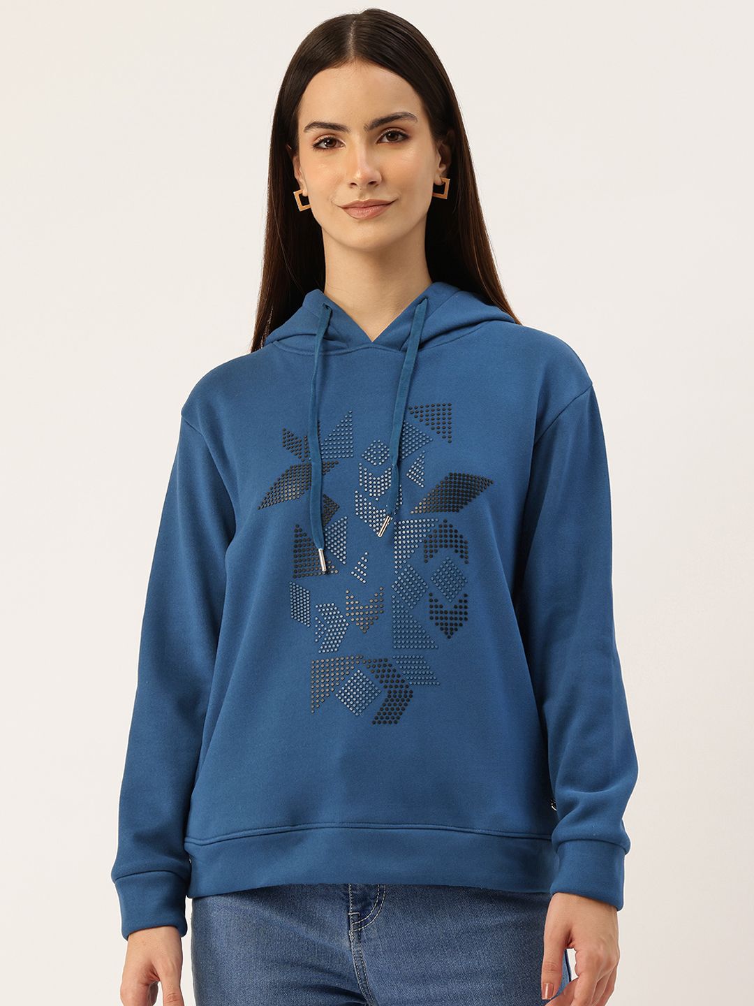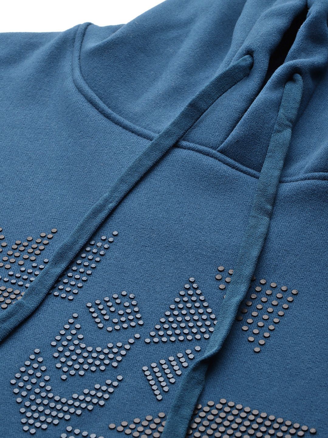 Teal embellished sweatshirt has a hooded, 2 insert pocket pockets, long sleeves, closure, ribbed hem