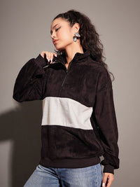 Black & white colourblocked sweatshirt has a mock collar, long sleeves, half zipper, ribbed hem