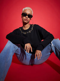 Black & gold-toned floral embroidered sweatshirt has a round neck, long sleeves, ribbed hem