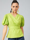 Athena Lime Green Knotted Wrap Top With Puffed Sleeves