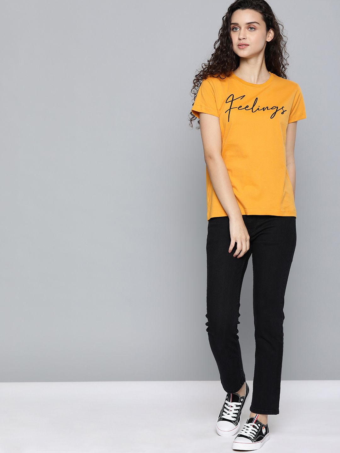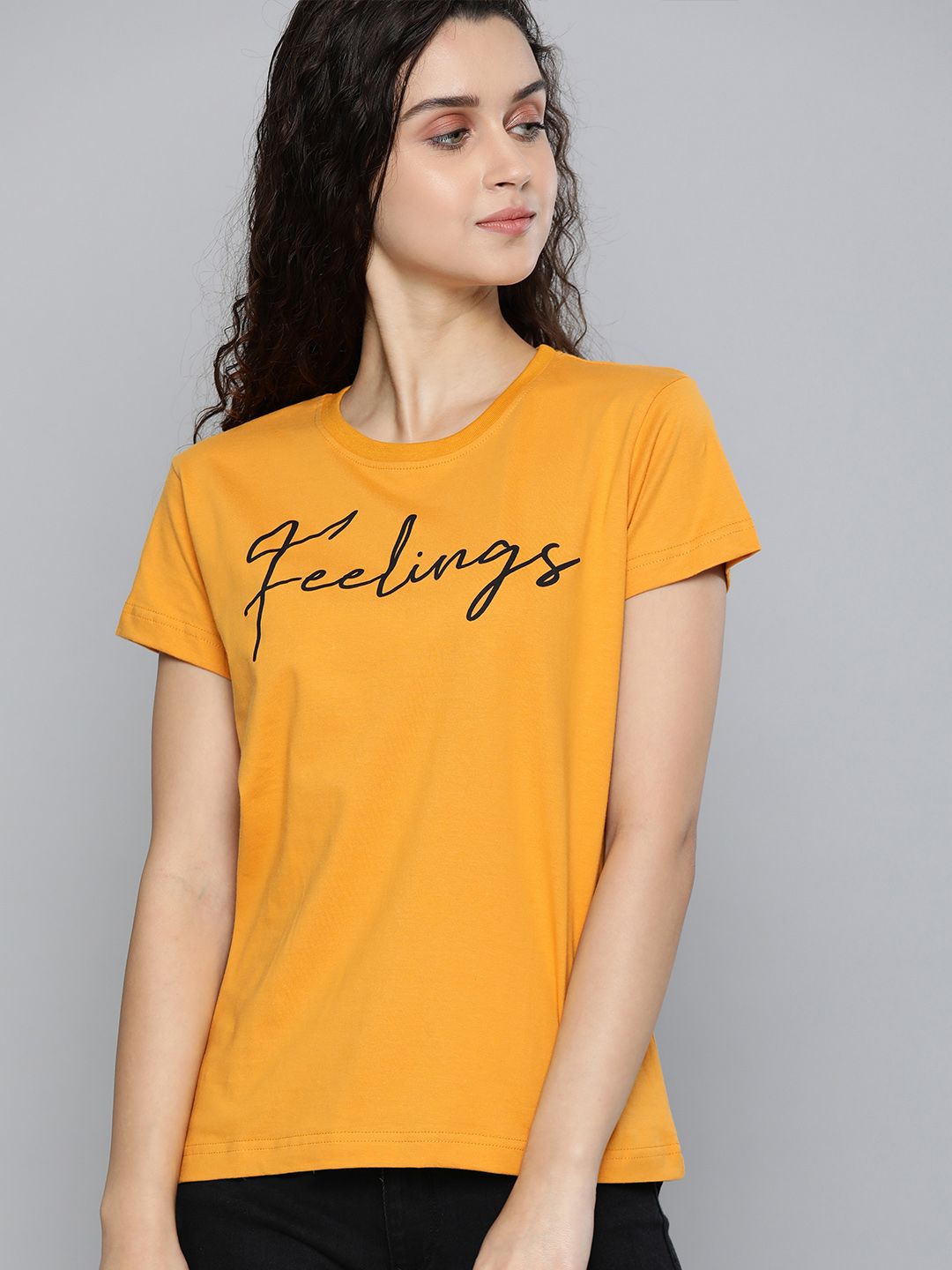 Mustard Yellow printed T-shirt, has a round neck, and short sleeves