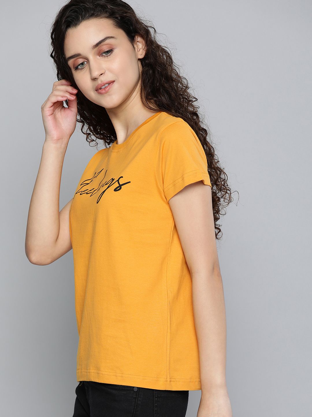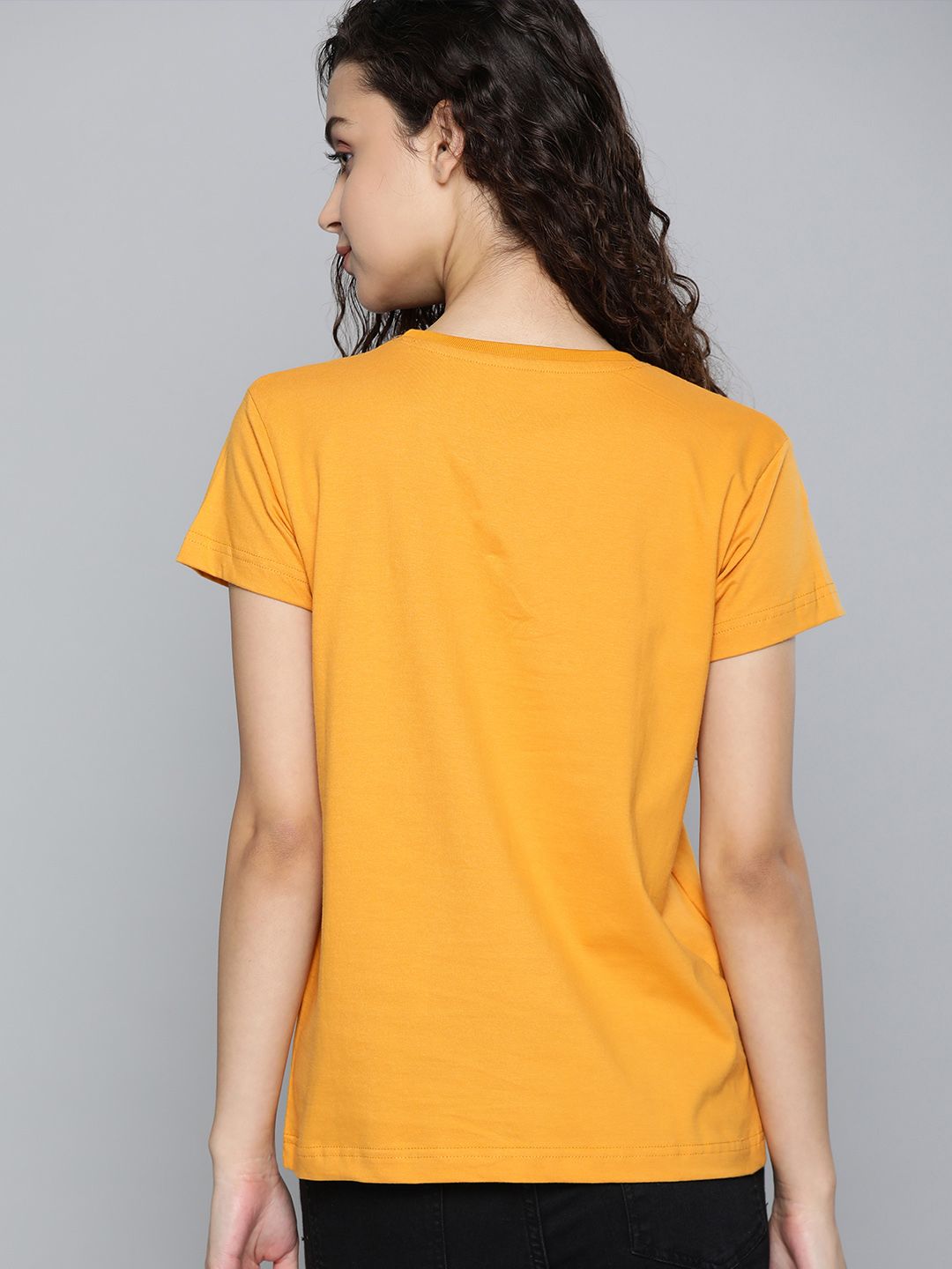 DILLINGER Women Mustard Yellow Printed Round Neck Regular Fit Pure Cotton T-shirt