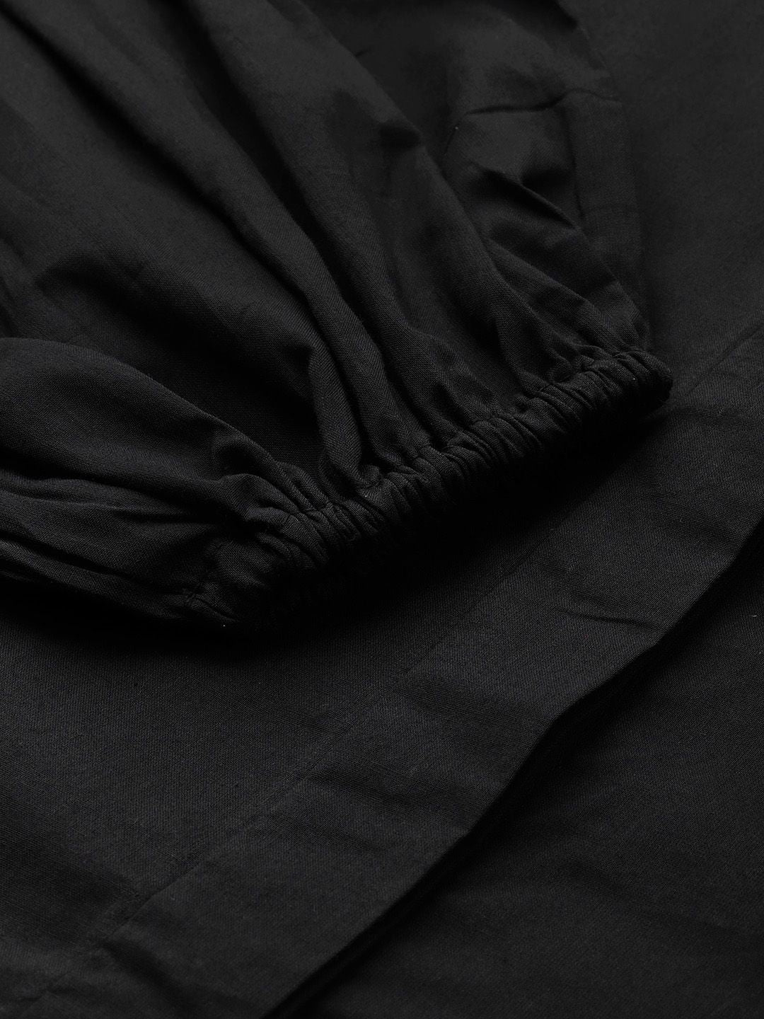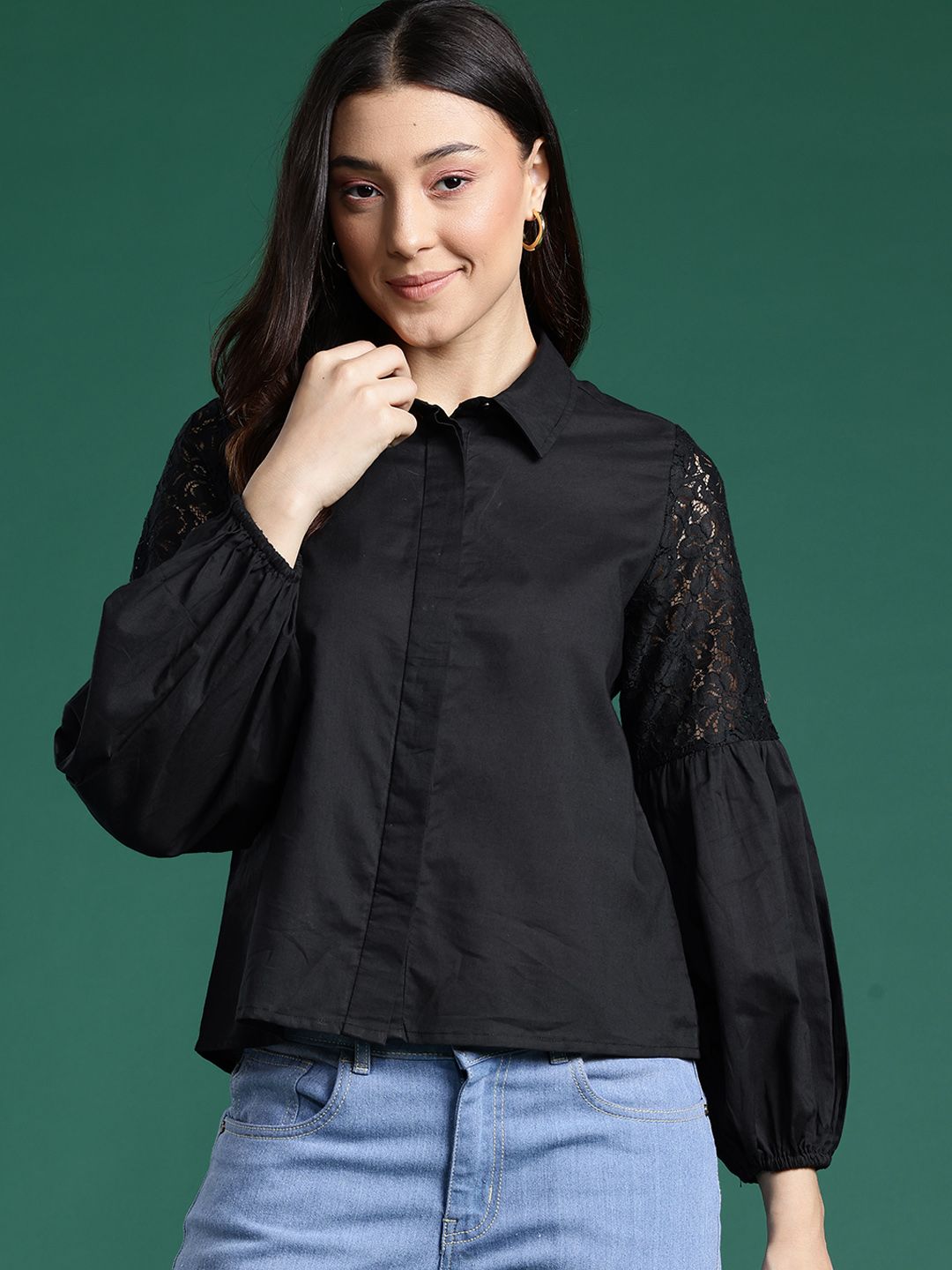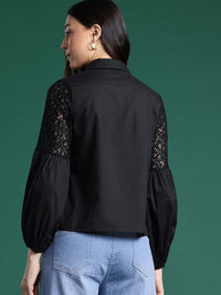 Black solid opaque casual shirt ,has a spread collar, concealed button placket, long puff sleeves with lace inserts, straight hem