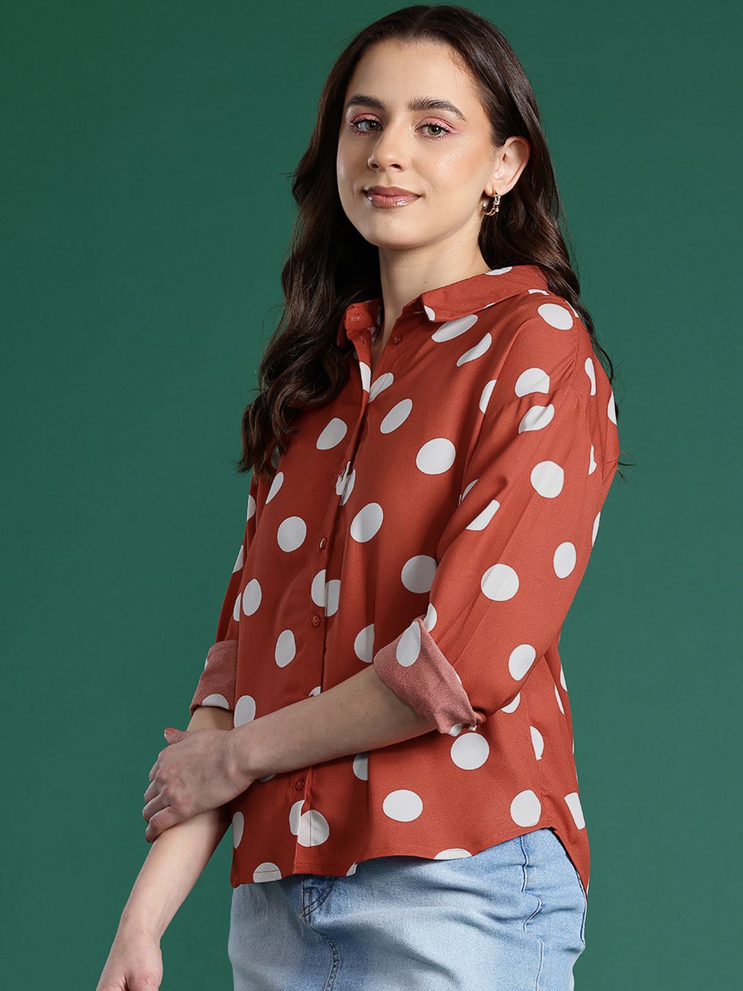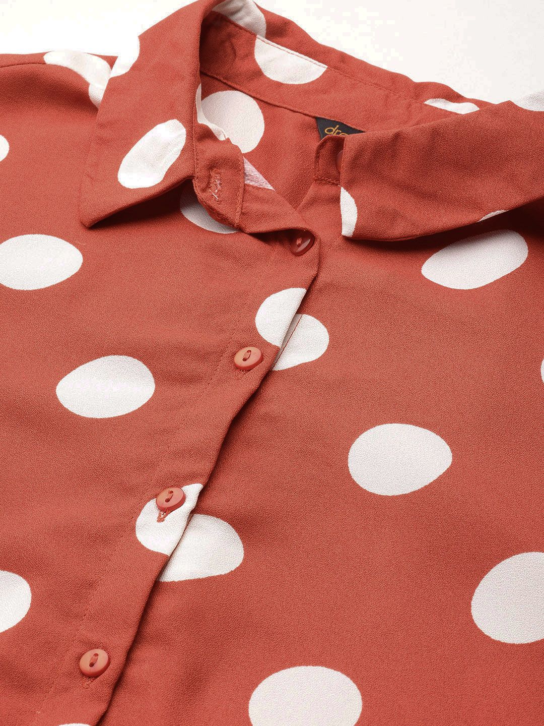 Rust red and off-white polka dot printed opaque Casual shirt ,has a spread collar, button placket, long regular sleeves, curved hem