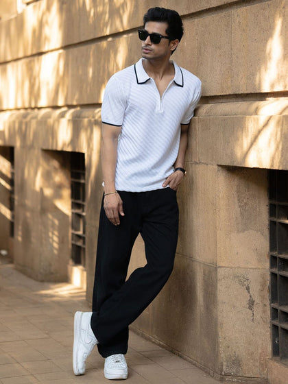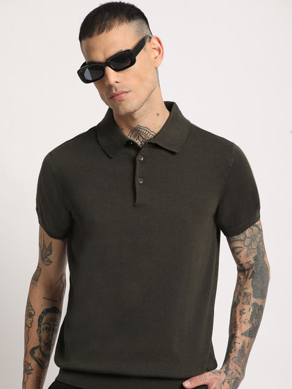 Powerlook Men Black Knitted Zipper Polo Collar Regular Fit T-shirt