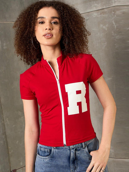 Women Typography Printed High Neck Pockets Slim Fit T-shirt