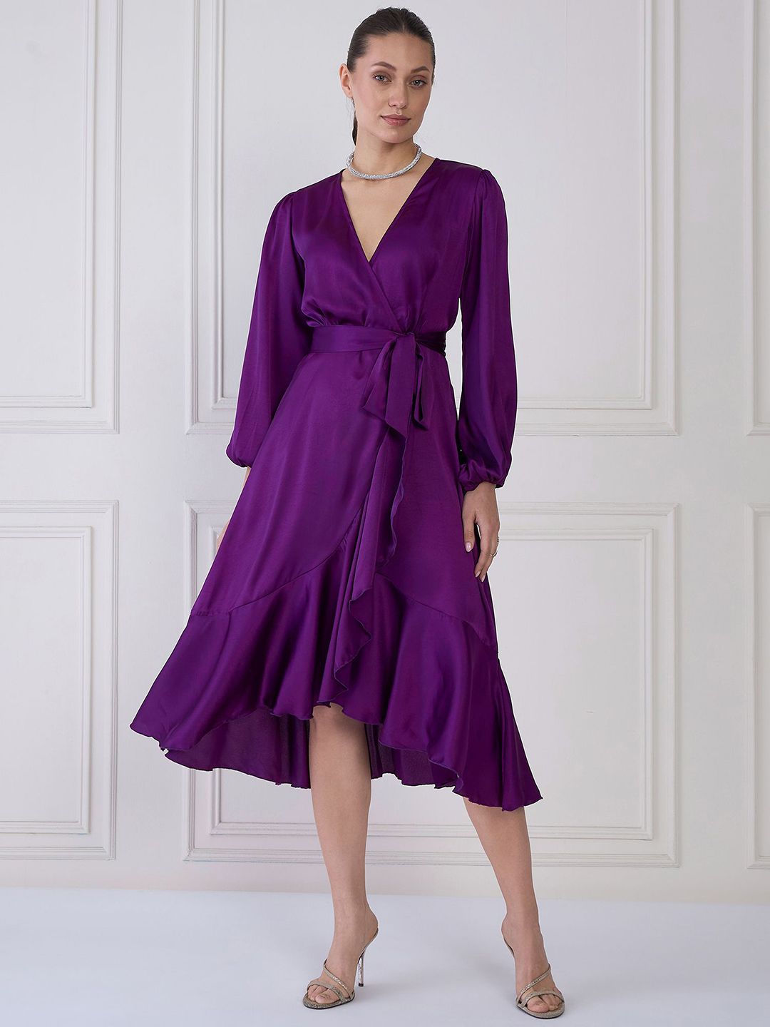 Antheaa Purple V-Neck Cuffed Sleeves Layered Satin Midi Wrap Dress