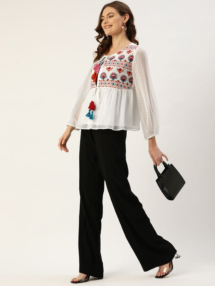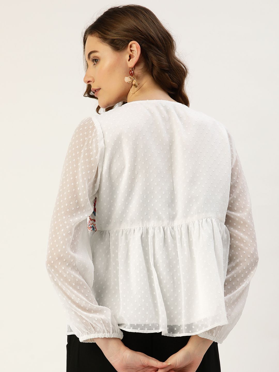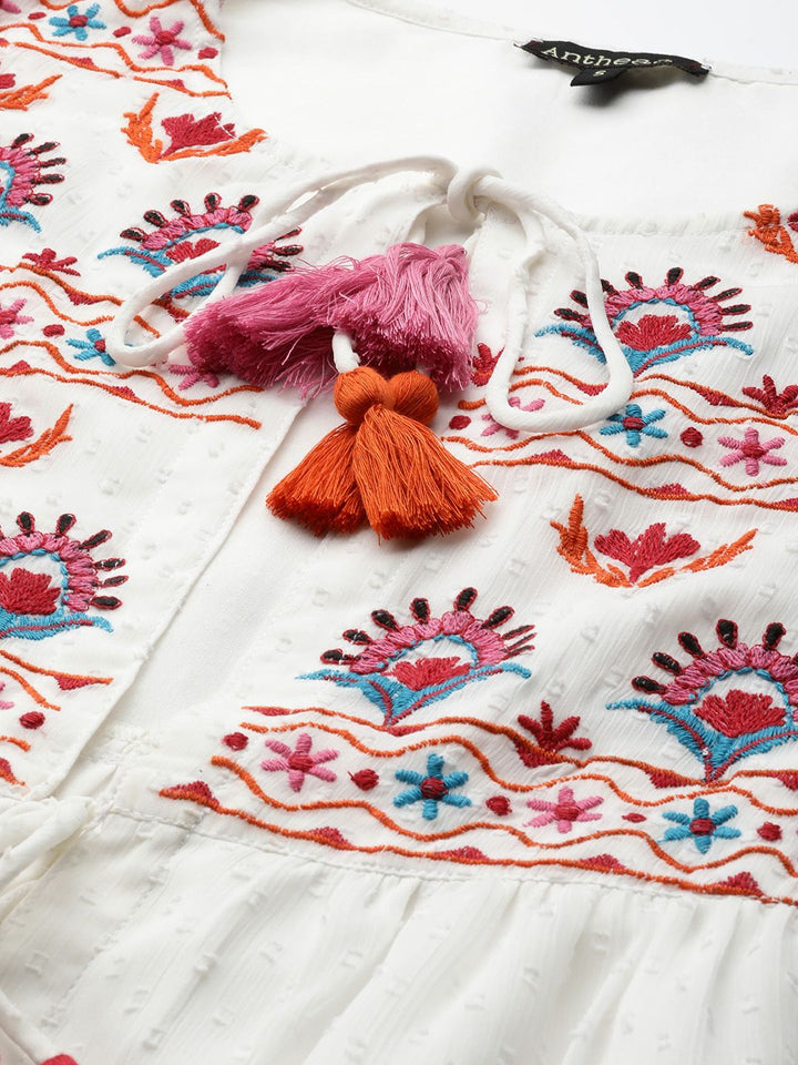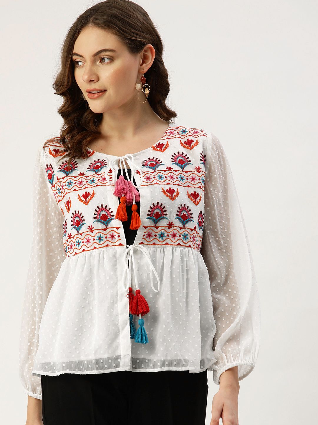 Antheaa Women Off White & Pink Printed Embroidered Tie-Up Shrug