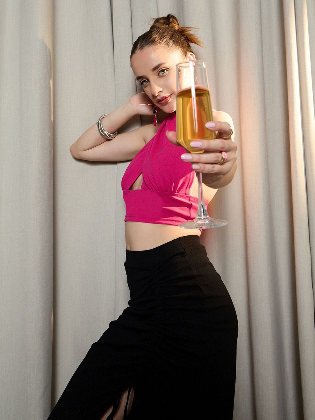Berrylush Women Halter Neck Criss Cross Fitted Crop Top