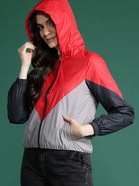 Red colourblocked tailored jacket, has a hooded, 2 pockets ,has a zip closure, long sleeves, straight hemline, polyester lining engineered with no