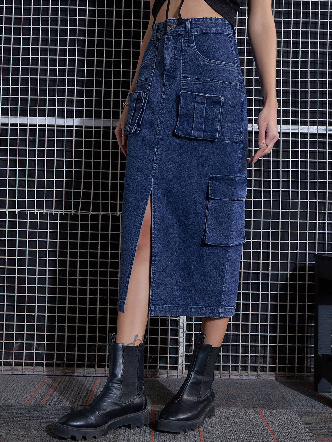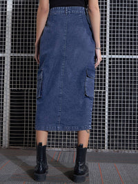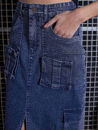 SASSAFRAS Blue Washed Cargo Pencil Midi Denim Skirt