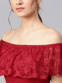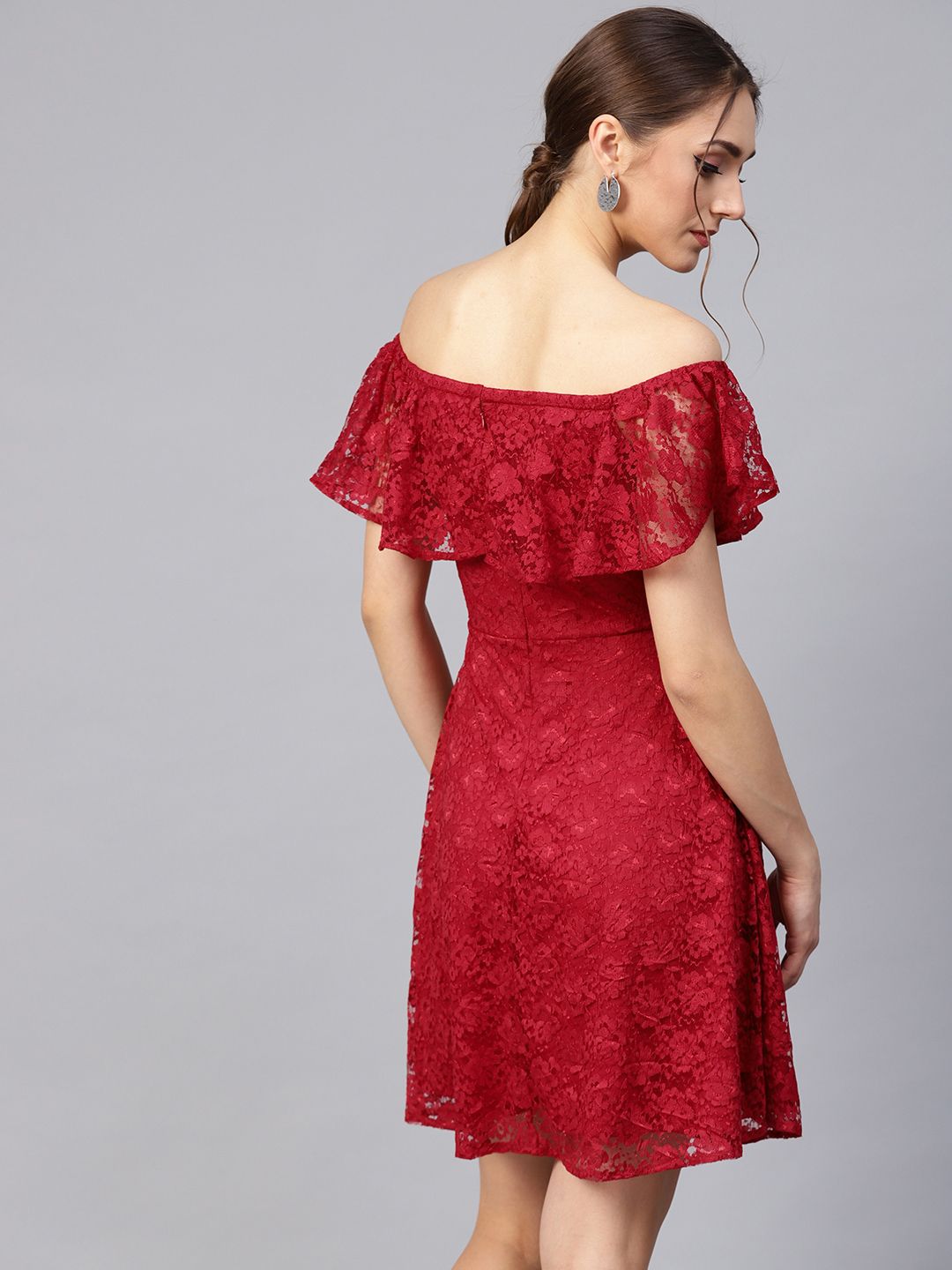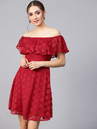 Red lace knitted layered fit and flare dress, has an off-shoulder neck, short sleeves, concealed zip closure on the back, an attached lining, flared hem