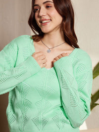 Green solid pullover, has a v-neck, long sleeves, ribbed hem